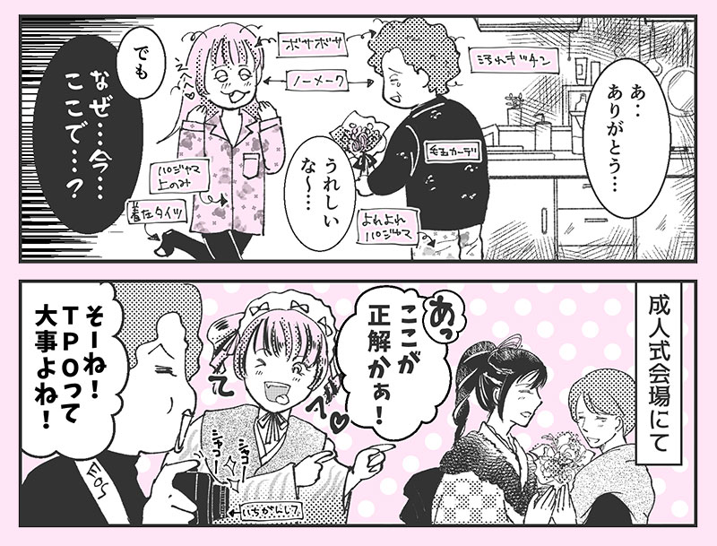 何故か手に花束をもっている…それはお友達と交換する予定の花束では?!