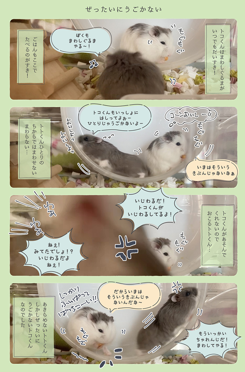 トコちゃんはまわしぐるまが大好きなご様子。ごはんはゆっくりまわしぐるまの上でいただくのが定番になってきています。